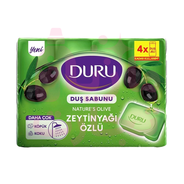 صابون حمام دورو DURU حاوی عصاره زیتون سیاه، بسته ۴ عددی به وزن کل 650 گرم، مناسب برای تمیزی و نرمکنندگی پوست، با فرمولاسیون ملایم و خوشبو، مناسب استفاده روزانه برای حفظ طراوت و لطافت طبیعی پوست بدن.