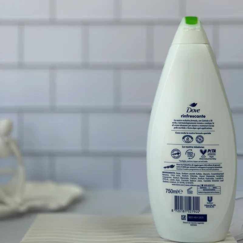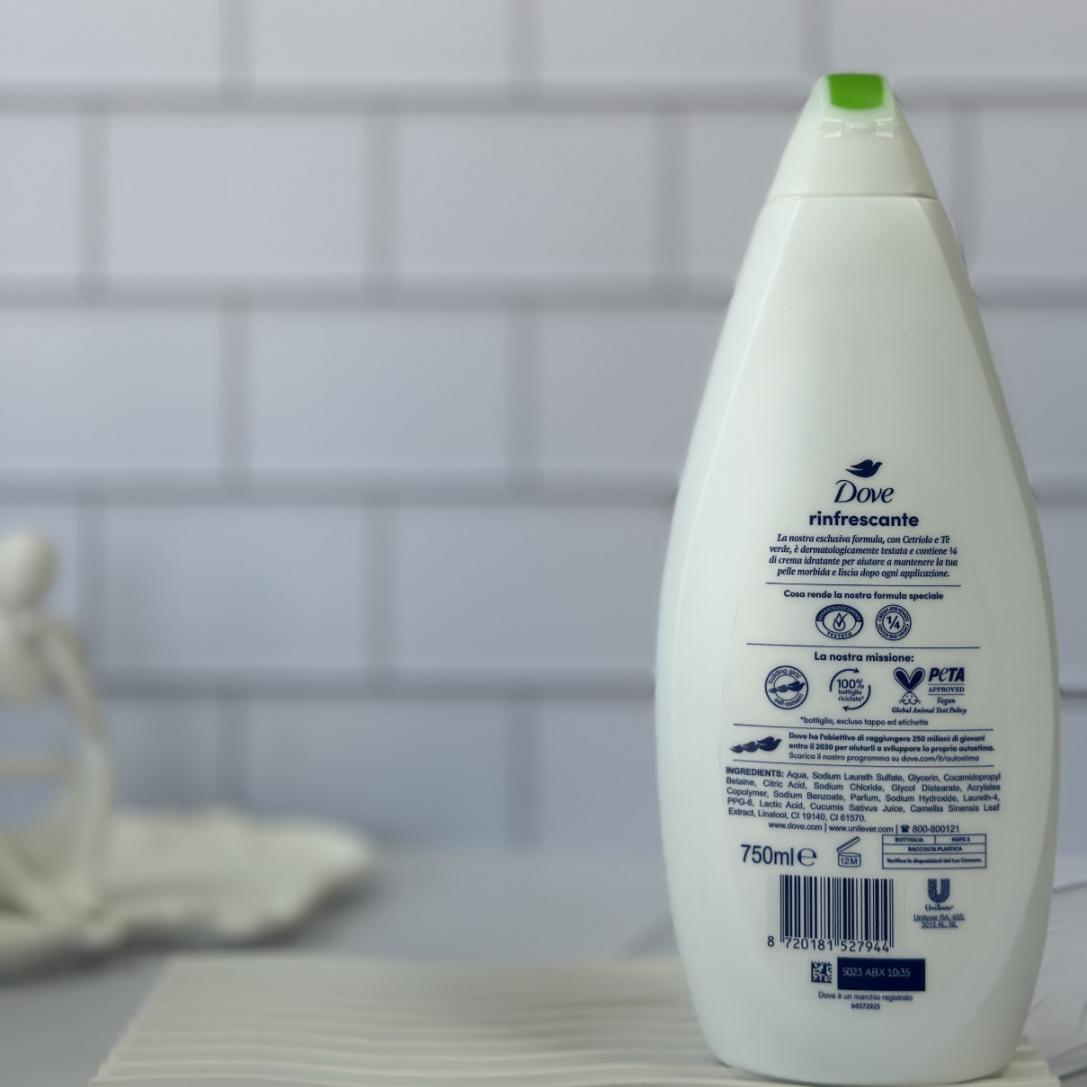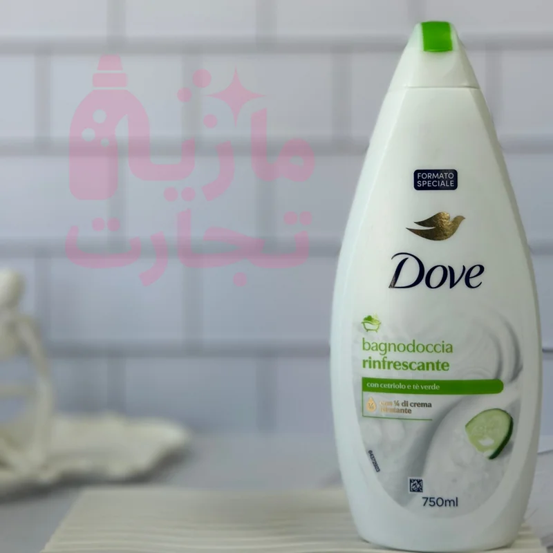 بطری این محصول با رنگ سفید و جزئیات سبز، جلوهای تمیز، تازه و طبیعتمحور دارد. لوگوی طلایی Dove و تصویر خیار و برگ چای سبز روی لیبل، حس طراوت و آرامش را القا میکند. عبارت "Formato Speciale" نشاندهندهی حجم ویژهی ۷۵۰ میلیلیتری محصول است که برای استفاده خانوادگی یا طولانیمدت بسیار مناسب است. طراحی ارگونومیک بطری باعث میشود که بهراحتی در دست قرار گیرد و استفاده از آن در حمام آسان باشد.