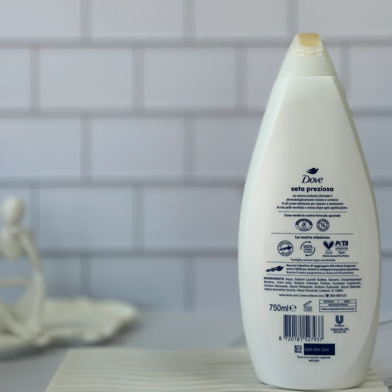 بطری این محصول با رنگ سفید و جزئیات طلایی، جلوهای شیک و لوکس دارد که حس پاکی، لطافت و ظرافت را القا میکند. لوگوی طلایی Dove و عبارت "Seta Preziosa" (ابریشم گرانبها) روی لیبل، نشاندهندهی کیفیت بالای محصول و تمرکز آن بر نرمی و لطافت پوست است. حجم ۷۵۰ میلیلیتری این محصول با عنوان "Formato Speciale" برای استفاده خانوادگی یا طولانیمدت بسیار مناسب است. طراحی ارگونومیک بطری باعث میشود که بهراحتی در دست قرار گیرد و استفاده از آن در حمام آسان باشد.