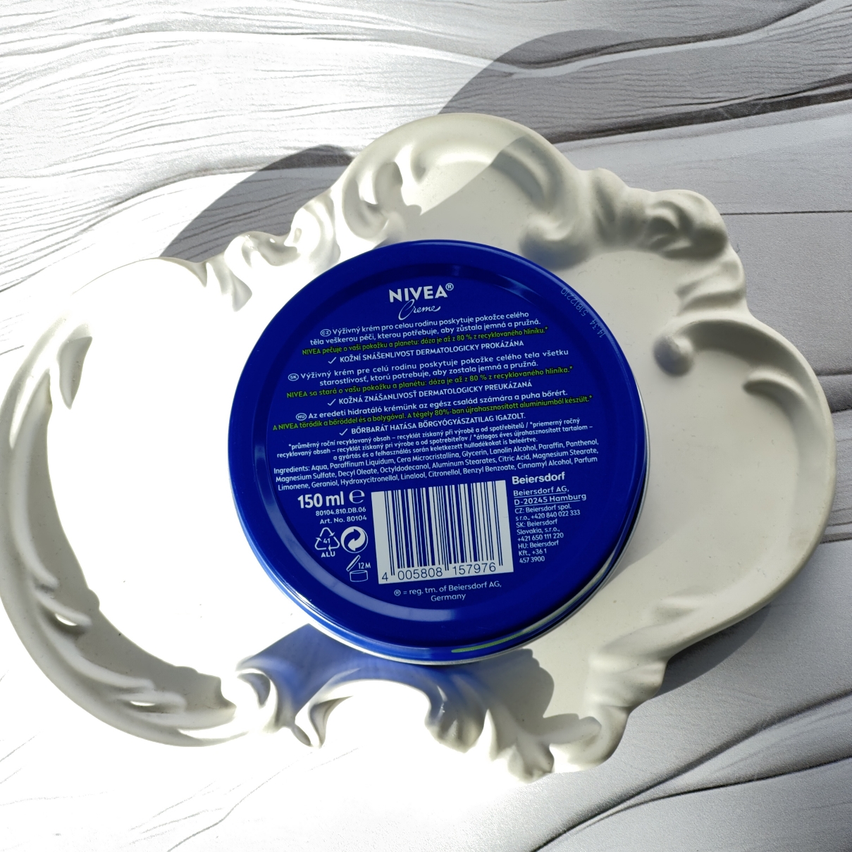 اولین چیزی که توجه شما را جلب میکند، بستهبندی دایرهای و آبیرنگ این محصول است. لوگوی سفید رنگ "NIVEA" با فونت برجسته و کلمه "Creme" با فونت دستنویس، حس نوستالژی و اعتماد را به مخاطب منتقل میکند. اما نکتهای که این بار بیشتر از همیشه به چشم میآید، برچسب سبز رنگی است که نشان میدهد تزئینات بستهبندی با ۸۰٪ مواد بازیافتی تولید شدهاند ♻️🌱