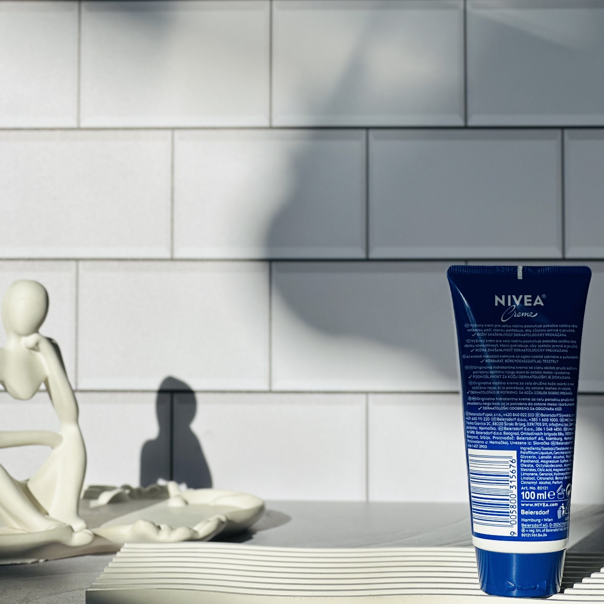 کرم نیوآ در بستهبندی آبیرنگ و مینیمال خود، حس نوستالژی و اعتماد را القا میکند. طراحی ساده اما شیک آن، بهراحتی قابل شناسایی است و در هر قفسهای بدرخشد. در تصویر بالا، این محصول در کنار یک مجسمه هنری و پسزمینهای با کاشیهای سفید قرار گرفته که زیبایی و سادگی آن را دوچندان کرده است. 👌