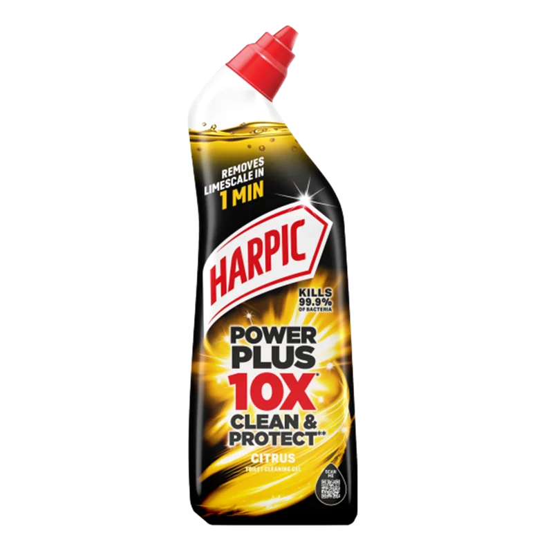بطری مشکیرنگ Harpic Power Plus با درب زاویهدار قرمز، از همان ابتدا حس قدرت و جدیت در پاکسازی رو منتقل میکنه. روی لیبل محصول، عباراتی مثل «REMOVES LIMESCALE IN 1 MIN»، «Kills 99.9% of Bacteria & Viruses» و «POWER PLUS 10X CLEAN & PROTECT» به چشم میخوره که نشوندهندهی ویژگیهای برجسته و عملکرد بینظیر این ژل هستن. 🧴⚡